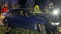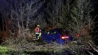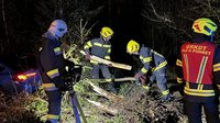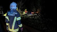 Ein PKW war aus bislang unbekannten Gründen von der Straße abgekommen und neben der Fahrbahn in Waldnähe zum Stehen gekommen. Aufgrund der schwierigen Bodenbeschaffenheit mussten vor Beginn der eigentlichen Bergung zunächst Äste und Bäume entfernt werden, um einen sicheren Zugang zum Fahrzeug zu ermöglichen.